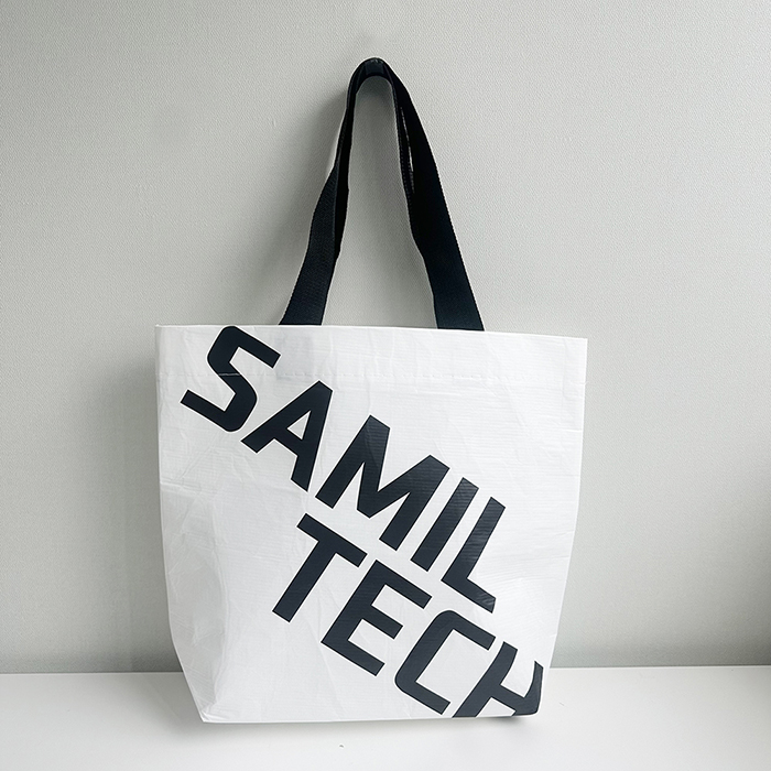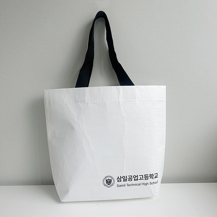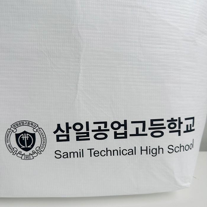 삼일공업고등학교 최소 수량 1000ea 원단 R-pet 160g 사이즈 450*380*130mm 바닥각형 인쇄 1도 동판인쇄 끈 기성 검정 웨빙끈 (외부길이 60cm, 폭 3.8cm) 옵션 원산지증명텍 ,X자봉제 목록보기