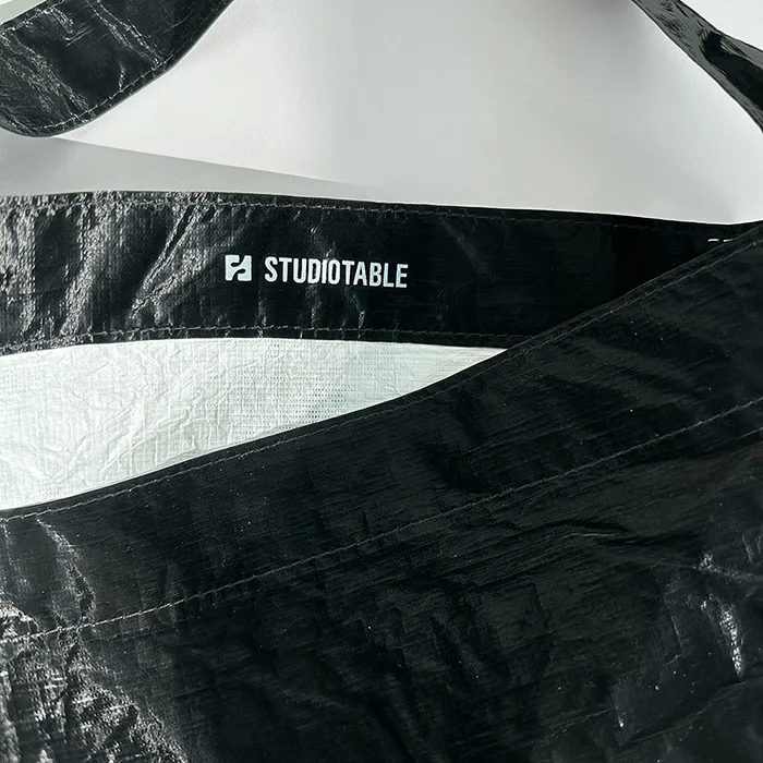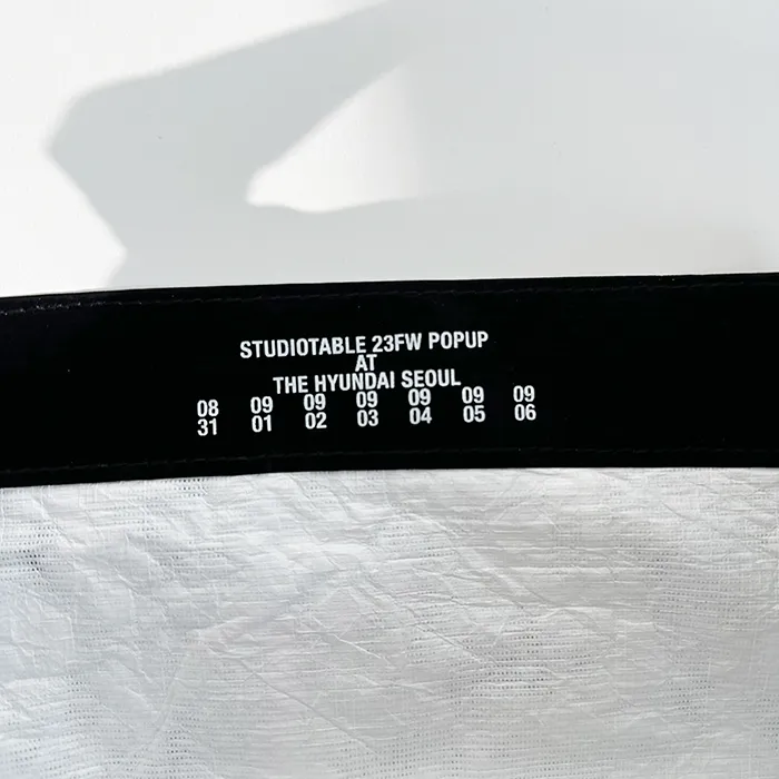 스튜디오 테이블 최소 수량 300ea 원단 타이벡 소프트(검정코팅) 사이즈 400*300mm 민자형 인쇄 단면1도 인쇄 내부 시접 인쇄 끈 제원단 한줄끈(폭3.8cm,총 외부길이 82cm) 옵션 X자 봉제 목록보기