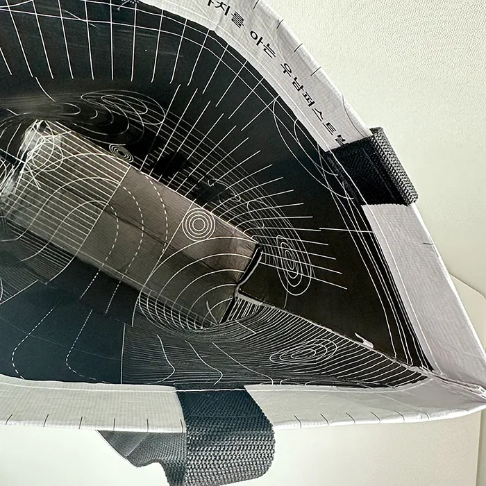 우남건설 최소 수량 1000ea 원단 R-pet 160g 사이즈 450*380*130mm 바닥각형 인쇄 1도 동판인쇄/내부인쇄 검정 끈 검정웨빙 어깨끈(외부길이 60cm / 두께 3.8cm) 옵션 X자봉제 목록보기