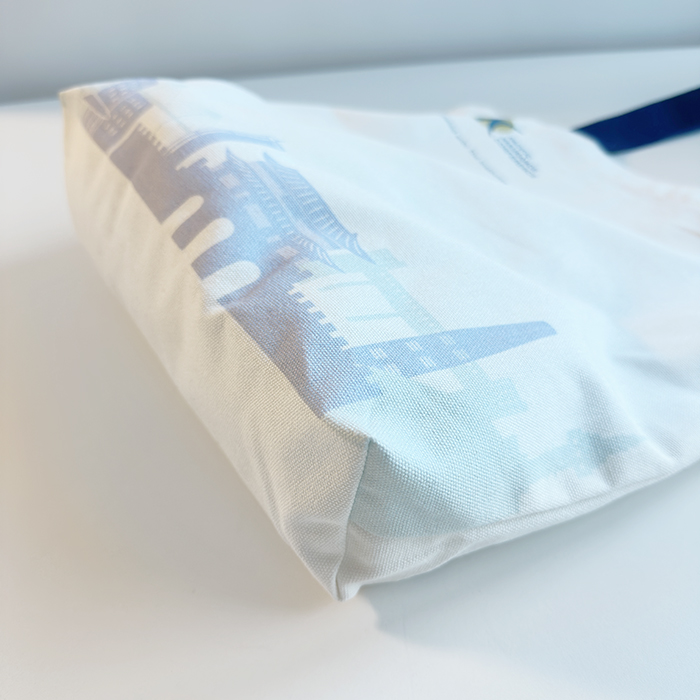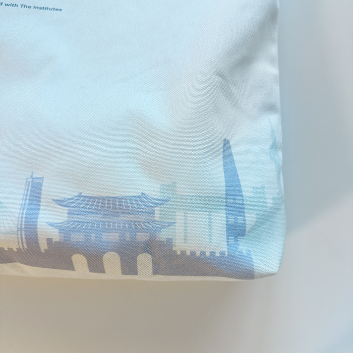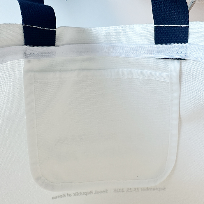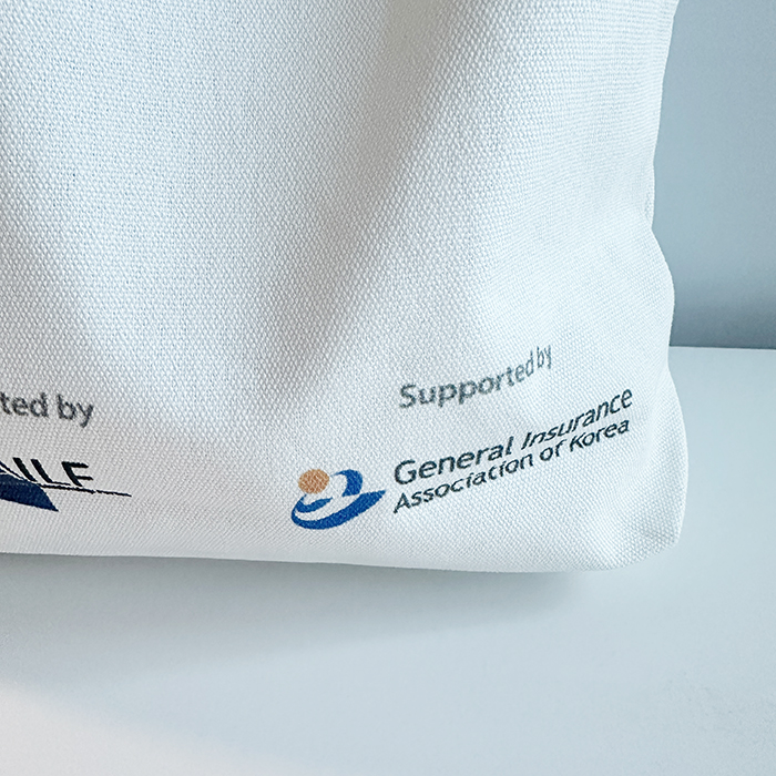 코멕스플랜에스 최소 수량 300ea 원단 10수 2합 캔버스 화이트 사이즈 370*370*80(mm) 바닥각형 인쇄 양면(전체) 디지털 인쇄 끈 네이비 웨빙 어깨끈 (외부길이 60cm, 폭 3cm) 옵션 제원단 안주머니(17*14cm) 상단 전체 지퍼(3호 흰색 지퍼, 3호 흰색 슬라이더) 목록보기
